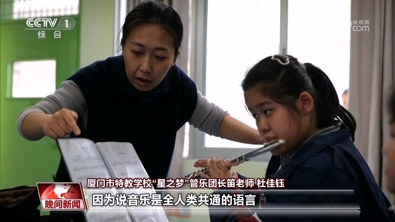 廈門(mén)市特教學(xué)?!靶侵畨?mèng)”管樂(lè)團(tuán)長(zhǎng)笛老師 杜佳鈺:因?yàn)檎f(shuō)音樂(lè)是全人類(lèi)共通的語(yǔ)言,我希望這件事情的意義也是能不要把這些孩子排除在全人類(lèi)的音樂(lè)的共同事業(yè)的范圍之外。