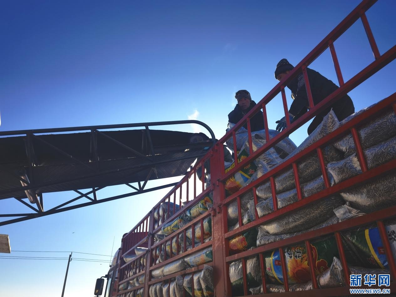 ??1月26日,內蒙古包頭市固陽縣紅泥井村糧油交易綜合市場內,工人們正在裝配葵花籽。新華網郝芳芳攝