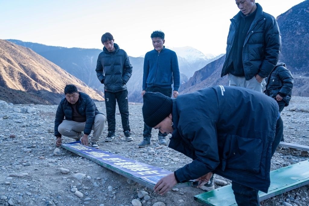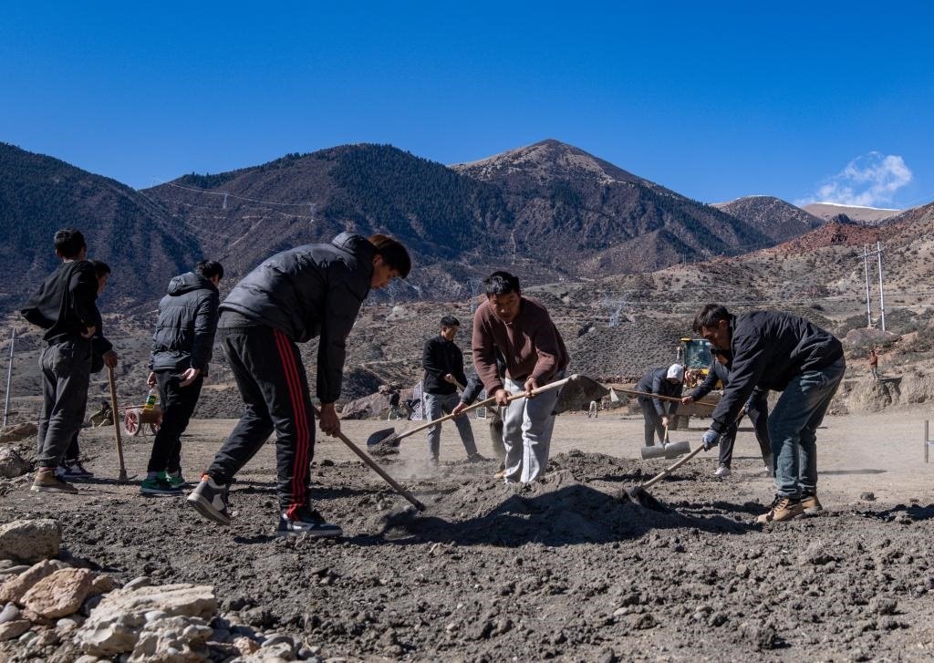 嘎瑪群美(中)和球員們正在平整球場(1月20日攝)