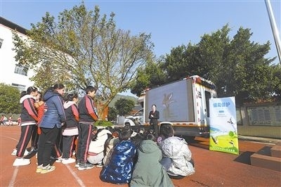 干警利用“車載便民法庭”播放宣傳片,教孩子們認(rèn)識(shí)棲息在當(dāng)?shù)氐恼滟F候鳥(niǎo)。