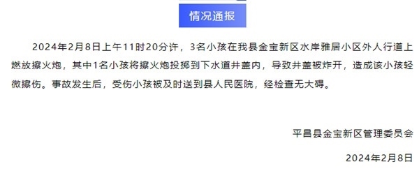 ·四川平昌通報(bào)“小孩放鞭炮炸飛多個井蓋”:1人輕微擦傷無大礙。