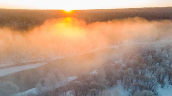 日出時分,在黑龍江省遜克縣克林鎮(zhèn)平臺村附近的大平臺霧凇景區(qū)拍攝的霧凇景觀。