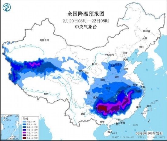 預(yù)計,2月20日8時至2月22日8時,華北南部、黃淮西部、江淮西部、江漢、江南中北部、貴州東部、廣西北部等地的部分地區(qū)將先后降溫8~10℃,其中,江漢、江南中西部、貴州東部等地將降溫12℃~14℃,湖南南部、江西南部、貴州東部、廣西北部等地的部分地區(qū)降溫可達16℃以上。