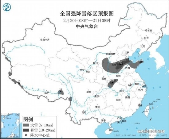預(yù)計2月20日08時至2月21日08時,陜西北部、山西中南部、河北中南部、山東中東部和北部、河南北部和西南部、湖北西北部、西藏西部和東南部等地的部分地區(qū)有大雪,其中,山西東南部、河北南部、山東西北部和東部、河南西南部、湖北西北部等地的部分地區(qū)有暴雪(10~19毫米)。上述部分地區(qū)新增積雪深度3~7厘米,局地可達10厘米以上。