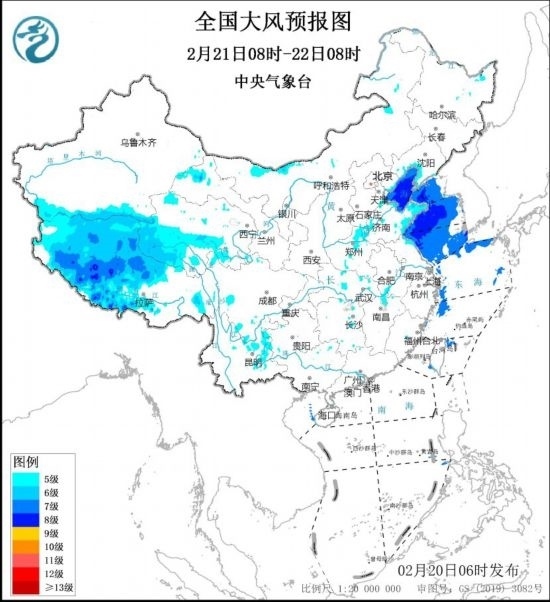 預(yù)計,2月20日8時至21日8時,西藏中西部、青海中南部、內(nèi)蒙古中西部、遼寧南部、華北東南部、黃淮西部和東部、江淮西部和北部等地的部分地區(qū)有5~7級風,陣風8~9級。渤海、渤海海峽、黃海大部海域?qū)⒂?~8級,陣風9~10級的大風。