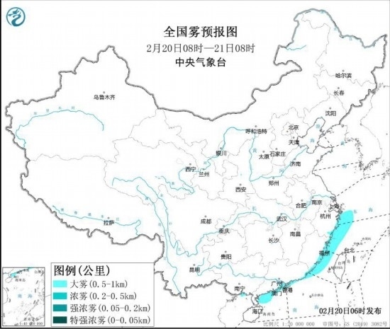 中央氣象臺2月20日6時繼續(xù)發(fā)布大霧黃色預(yù)警: