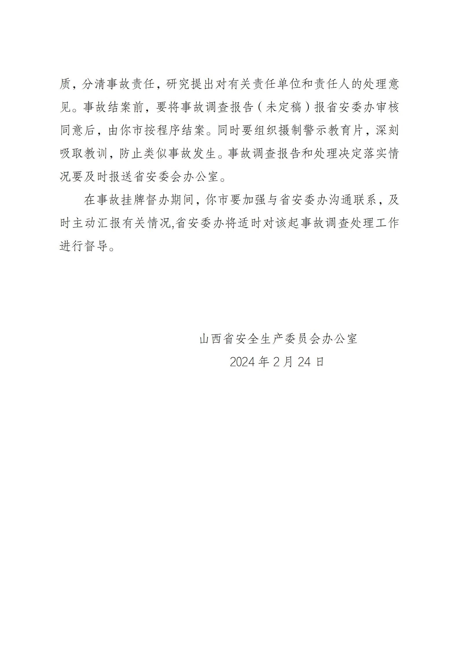 根據(jù)《國(guó)務(wù)院關(guān)于進(jìn)一步加強(qiáng)企業(yè)安全生產(chǎn)工作的通知》《山西省較大事故查處掛牌督辦辦法》等有關(guān)規(guī)定要求,山西省安委辦決定對(duì)該起事故查處實(shí)行掛牌督辦。要求呂梁市依據(jù)有關(guān)法律法規(guī)和規(guī)定,組織進(jìn)行事故調(diào)查,查明事故原因,認(rèn)定事故性質(zhì),分清事故責(zé)任,研究提出對(duì)有關(guān)責(zé)任單位和責(zé)任人的處理意見。事故結(jié)案前,要將事故調(diào)查報(bào)告報(bào)山西省安委辦審核同意后,由呂梁市按程序結(jié)案。同時(shí)要組織攝制警示教育片,深刻吸取教訓(xùn),防止類似事故發(fā)生。事故調(diào)查報(bào)告和處理決定落實(shí)情況要及時(shí)報(bào)送山西省安委辦。