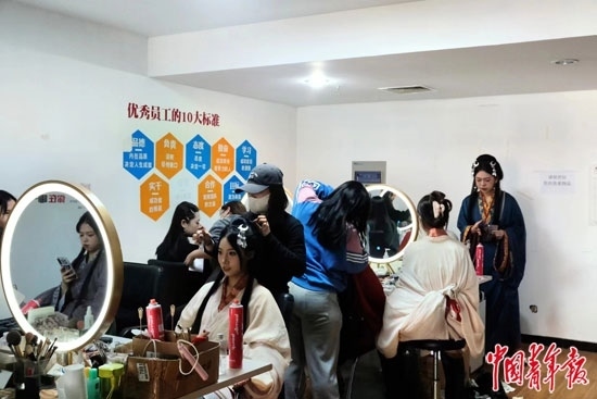 河北省邯鄲市叢臺(tái)公園附近一家旅拍館內(nèi),游客排隊(duì)體驗(yàn)漢服妝造。焦晶嫻/攝