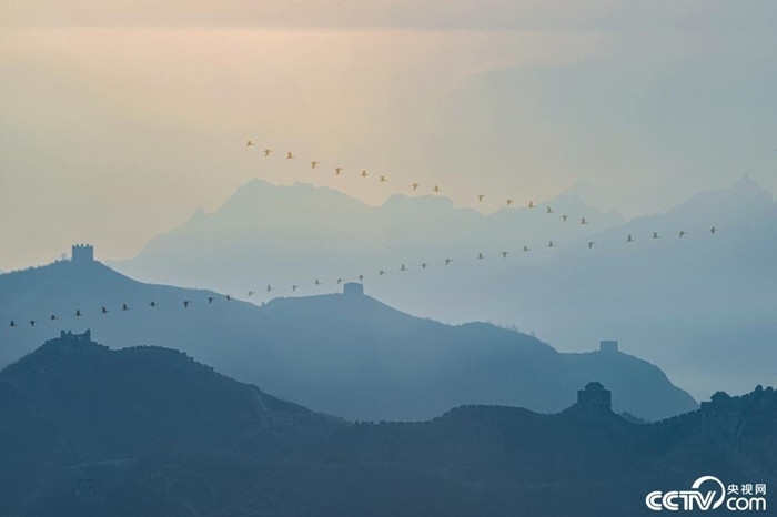 3月7日,河北承德,遷徙的候鳥飛過金山嶺長城上空。