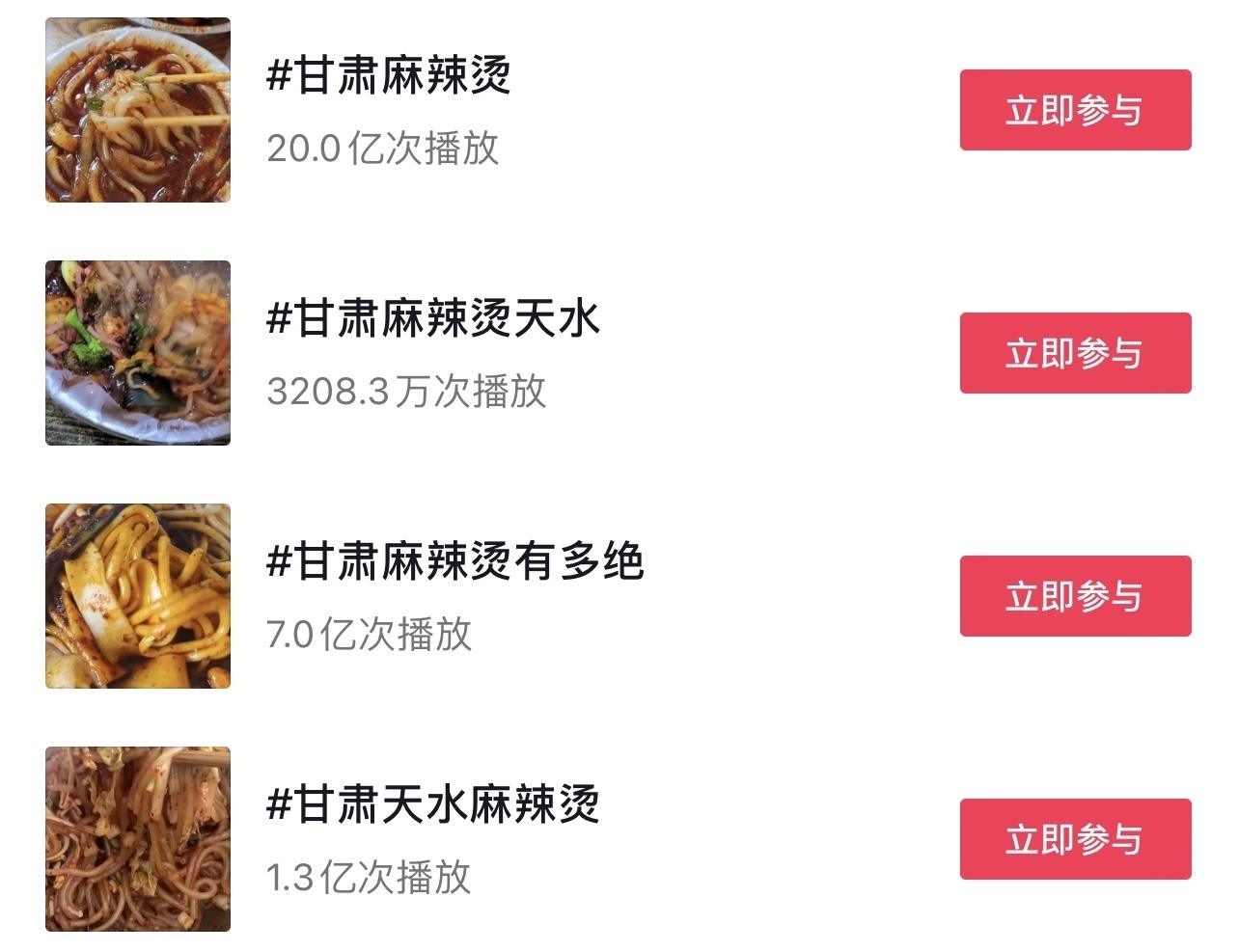 “這兩條視頻吸引了大量網(wǎng)民觀看、點(diǎn)贊、轉(zhuǎn)發(fā),之后陸續(xù)有網(wǎng)民發(fā)布相關(guān)視頻。”3月18日,甘肅省文化和旅游廳在回復(fù)網(wǎng)友建議中提到,3月份以來(lái),“甘肅麻辣燙”話題迅速發(fā)酵,視頻內(nèi)容迅速增加,多次登上抖音、快手等短視頻平臺(tái)熱榜。截至3月16日18:00,各大短視頻平臺(tái)上“甘肅麻辣燙”相關(guān)話題累計(jì)播放量已超過(guò)32.6億次。