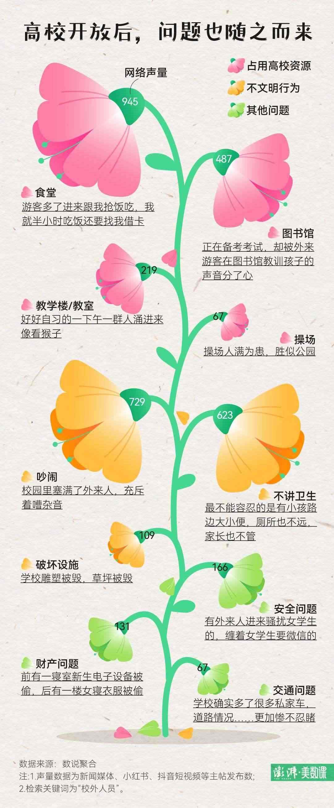 不僅是武大學(xué)生,在社交媒體上,不少高校學(xué)生近期都表示遇到了類似的煩惱。澎湃新聞在數(shù)說(shuō)聚合平臺(tái)上檢索了近一個(gè)月來(lái),包括小紅書、抖音等在內(nèi)平臺(tái)上提到“校外人員”的帖子后發(fā)現(xiàn),校園開放后學(xué)生們最大的困擾,就是游客太多,導(dǎo)致食堂、圖書館等校園資源被侵占。