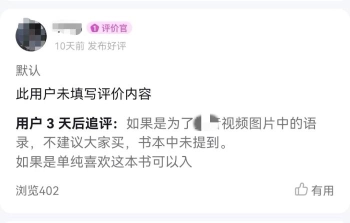 例如,在余華《我們生活在巨大的差距里》這本書的購(gòu)買評(píng)論里,有人就提到,“如果是為了視頻圖片中的語錄,不建議大家購(gòu)買,書本中未提到。”