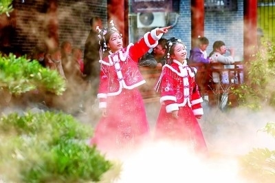 夜幕降臨后,襄陽(yáng)古城迎來(lái)了一天最具魅力的時(shí)刻。漫步在店鋪林立、游人如織的北街上,遠(yuǎn)處巍峨聳立的昭明臺(tái)燈火輝煌,全長(zhǎng)1200多米的寬闊街道上,一座座石牌坊坐落其間,兩側(cè)雅致的青磚馬頭墻、明艷的朱紅立柱、優(yōu)美的墀頭朱雀,展示著古老而又時(shí)尚的文化韻味。在北街循著巷子?xùn)|行,便來(lái)到了新近開放的管家巷歷史文化商業(yè)街區(qū)。在襄音廣場(chǎng),隨著音樂聲響起,年輕的演員們與游客共同跳起歡快的舞蹈。管家巷文化休閑街區(qū)運(yùn)營(yíng)負(fù)責(zé)人劉洋介紹:“《詩(shī)畫襄陽(yáng)》《俠義襄陽(yáng)》《舞墨襄陽(yáng)》等10部極具襄陽(yáng)韻味的特色劇目,在管家巷全程免費(fèi)開放,劉備、諸葛亮、李白、杜甫、孟浩然等30多位歷史名人的扮演者,走街串巷、演藝互動(dòng),游客仿佛穿越至千年前的襄陽(yáng)?!?/p>