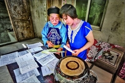 薅草鑼鼓傳承人吳正菊(左)教授女兒廖傳述薅草鑼鼓知識(shí)。張勇攝