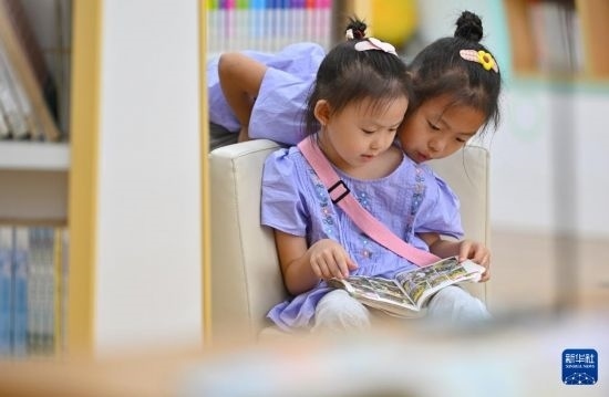 5月2日,家長(zhǎng)帶著孩子在位于??谑械暮D鲜D書館讀書。