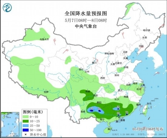 5月7日08時(shí)至8日08時(shí),湖南南部、四川盆地東南部、重慶、貴州南部、廣西、廣東等地部分地區(qū)有中到大雨,其中,貴州南部、廣西西北部、廣東西北部和東南部等地部分地區(qū)有暴雨(50~80毫米)。內(nèi)蒙古中部、黑龍江東北部、遼寧東部、甘肅河西、浙江北部等地部分地區(qū)有4~6級(jí)風(fēng),新疆東部部分地區(qū)有6~7級(jí)風(fēng)。