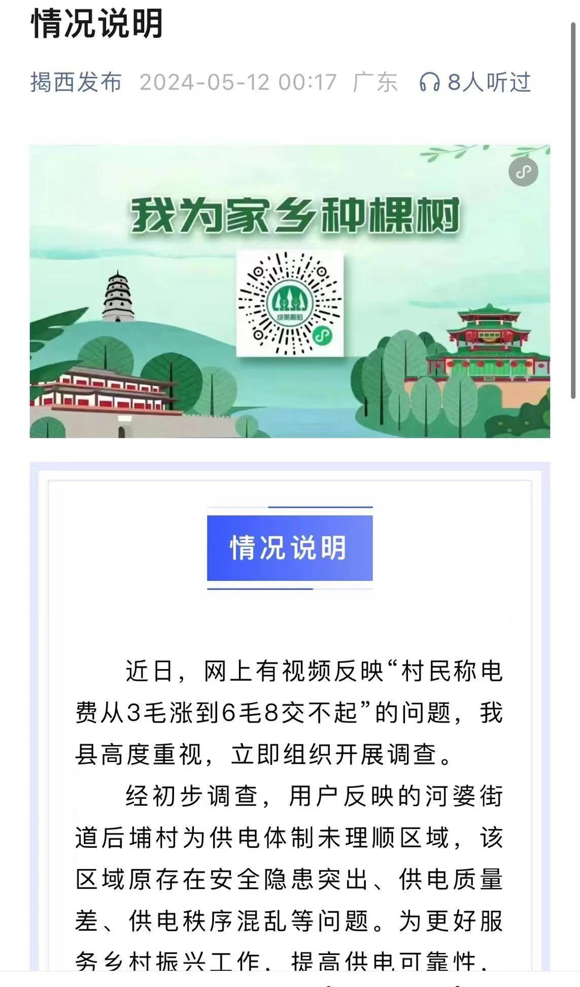 針對此事,“揭西發(fā)布”微信公眾號(hào)于5月12日發(fā)布了情況說明,表示對網(wǎng)上反映的“村民稱電費(fèi)從3毛漲到6毛8交不起”的問題高度重視,并已立即開展調(diào)查。