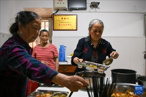 4月15日,馮懿蘋(右)與成都視障者互助協(xié)會家屬志愿者為樂隊成員準備午飯。新華社記者 胥冰潔 攝