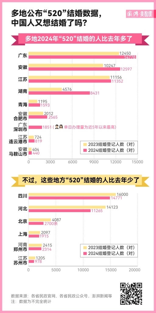 2023 年多地“520”領(lǐng)證人數(shù)下跌,引起熱議。2024 年的“520”剛剛過去,多地披露了當(dāng)日結(jié)婚登記數(shù)。廣東、安徽、江蘇等省當(dāng)日領(lǐng)證人數(shù)較去年有回升。澎湃新聞從深圳市民政局獲悉,截至 5 月 20 日 18 時(shí) 30 分,“520”全天共辦理結(jié)婚登記 1851 對,單日辦理量為近 5 年以來最高。中國人又重燃對婚姻的渴望了嗎?