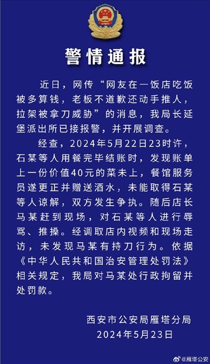 ·網(wǎng)友稱在飯店吃飯被多算錢還遭威脅,西安雁塔警方通報。
