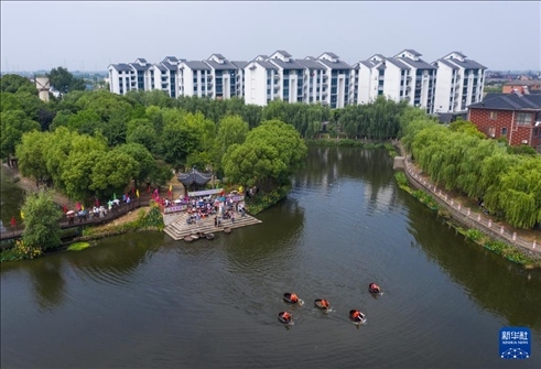 當(dāng)日,浙江省湖州市吳興區(qū)東林鎮(zhèn)舉辦“慶端午 劃菱桶”水鄉(xiāng)端午趣味民俗活動(dòng),來自東林鎮(zhèn)各村的村民們在泉益村參加了水鄉(xiāng)劃菱桶比賽、荷塘釣小龍蝦、做艾草花束、包粽子等端午趣味民俗活動(dòng),在初夏時(shí)節(jié)呈現(xiàn)江南水鄉(xiāng)特有的迎端午氣氛。