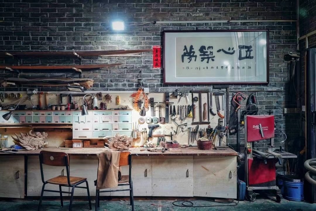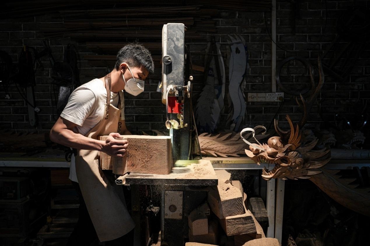 張偉潮身上的傷也沒斷過?!疤焯旄洞蚪坏溃袝r候傷口剛縫了線,回到家一干活,刀口又開了”,手臂上、手背上遍布的傷疤,見證了每一個龍頭的誕生?!懊肯乱坏叮叶家呀?jīng)想好了后面的第二步、第三步”,龍頭雕刻極為考究,從選料、切割,到粗雕、精雕,再到打磨、拋光、裱漆,十幾道繁瑣工序,全靠師傅的眼光和手藝。機(jī)械化、流水線,做不出龍頭嗎?在數(shù)不清的日夜里,光影斑駁間,張偉潮拿著父輩傳下的一刀一錘,一下一下,慢慢開鑿,給出自己的答案。