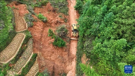 6月18日,工作人員駕駛機(jī)械在貴州省黔東南苗族侗族自治州錦屏縣鐘靈鄉(xiāng)清理進(jìn)村道路(無(wú)人機(jī)照片)。