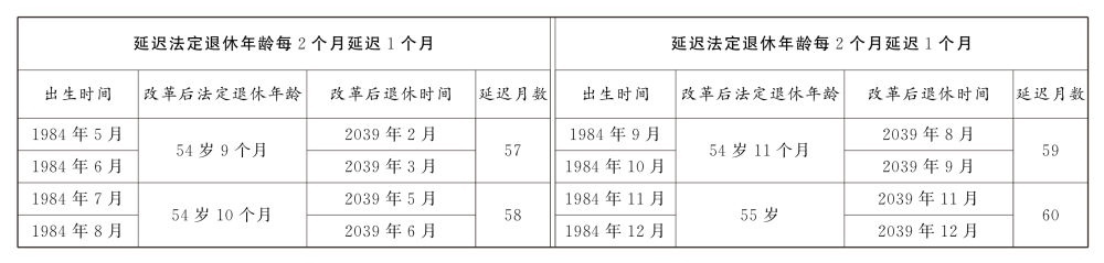 一、同步啟動(dòng)延遲男、女職工的法定退休年齡,用十五年時(shí)間,逐步將男職工的法定退休年齡從原六十周歲延遲至六十三周歲,將女職工的法定退休年齡從原五十周歲、五十五周歲分別延遲至五十五周歲、五十八周歲。