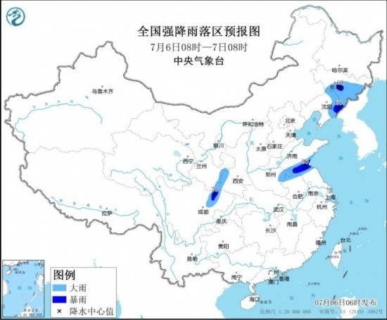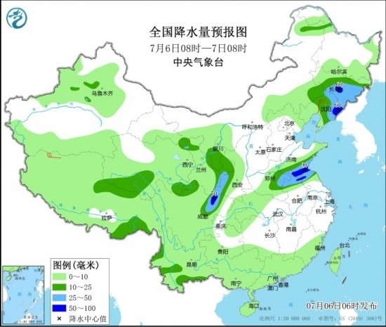 7月6日08時至7日08時,內(nèi)蒙古東南部、東北地區(qū)中東部和西部、西藏北部和東南部、青海南部、西北地區(qū)東北部、黃淮東部和西部、江淮東部和西部、四川盆地西北部、云南西南部等地部分地區(qū)有中到大雨,其中,吉林中東部、遼寧東部、山東南部、江蘇北部、四川盆地西北部等地部分地區(qū)有暴雨(50~90毫米)。遼寧中部、西藏西部等地部分地區(qū)有4~6級風。