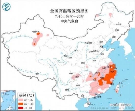 全國高溫落區(qū)預報圖(7月6日08時-20時) 圖源:中央氣象臺網(wǎng)站
