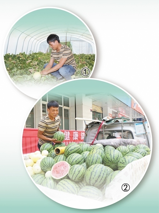 圖①:魏俊治在大棚采摘白蘭瓜。 本報記者 趙帥杰攝 圖②:魏俊治在蘭州城內攤點售賣西瓜、白蘭瓜。何宏軍攝(人民視覺)