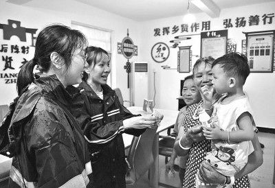 7月25日,在福建福清市江陰鎮(zhèn)后陳村轉(zhuǎn)移安置點,鄉(xiāng)鎮(zhèn)工作人員(左一、左二)給轉(zhuǎn)移安置群眾送來食品和生活必需品。新華社記者 魏培全攝