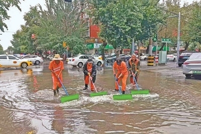 7月26日,遼寧省氣象局發(fā)布暴雨橙色預(yù)警。受強(qiáng)降水影響,遼寧有11個市啟動了防汛應(yīng)急響應(yīng)。圖為26日環(huán)衛(wèi)工人在沈陽市街頭清除積水。新華社發(fā)