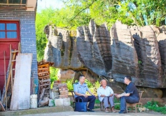 圖②:干警與村干部親切交談,交流“楓橋經(jīng)驗”工作。