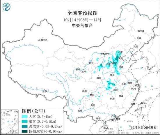 全國霧預(yù)報圖(10月14日8時-14時) 圖片來源:中央氣象臺網(wǎng)站