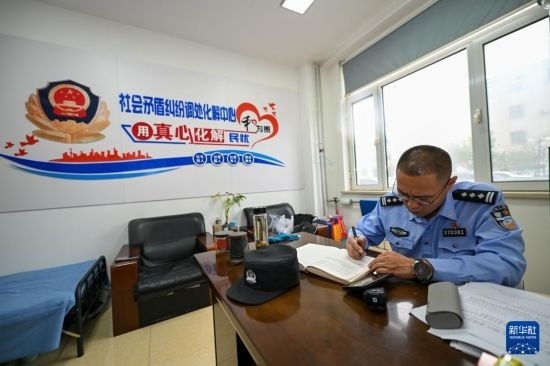 在天津市東麗區(qū)萬新派出所,平亞楠在記錄本上填寫調解情況記錄(9月30日攝)。
