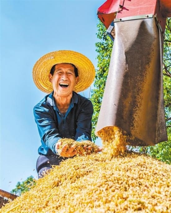 10月10日,湖南省東安縣紫溪市鎮(zhèn)中心村,農(nóng)民在高標(biāo)準(zhǔn)農(nóng)田收獲晚稻。今年前三季度,全國(guó)夏糧早稻產(chǎn)量合計(jì)17795萬(wàn)噸,比上年增加346萬(wàn)噸,增長(zhǎng)2.0%。蔡小平攝(中經(jīng)視覺(jué))