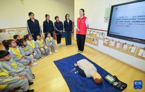 10月22日,國網(wǎng)浙江湖州供電公司“救”在身邊志愿服務(wù)隊(duì)的黨員志愿者梅月圓(右一)在長興縣開發(fā)區(qū)中心幼兒園開展應(yīng)急救護(hù)培訓(xùn)和急救知識(shí)普及。紅十字二級(jí)應(yīng)急救護(hù)師梅月圓是應(yīng)急救護(hù)培訓(xùn)志愿者,也是浙江省三八紅旗手。