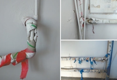 黑龍江綏化市明水縣東城社區(qū)統(tǒng)一供熱后,為防止各公用樓道單元暖氣管道散熱損失熱量,將其全都包裹上了泡沫塑料并纏上膠帶。然而,由于缺乏定期維護(hù),目前很多樓道單元外包護(hù)熱的泡沫塑料及膠帶,都有不同程度的破損(見圖)。