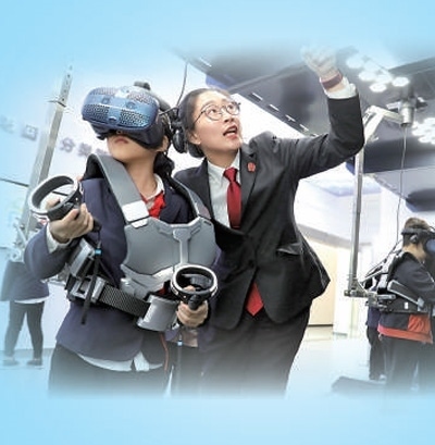在浙江湖州市南潯區(qū)未成年人道德法治體驗(yàn)館,南潯區(qū)人民法院法官(右一)指導(dǎo)小學(xué)生運(yùn)用虛擬現(xiàn)實(shí)體驗(yàn)設(shè)備接受法治教育。項(xiàng) 飛攝