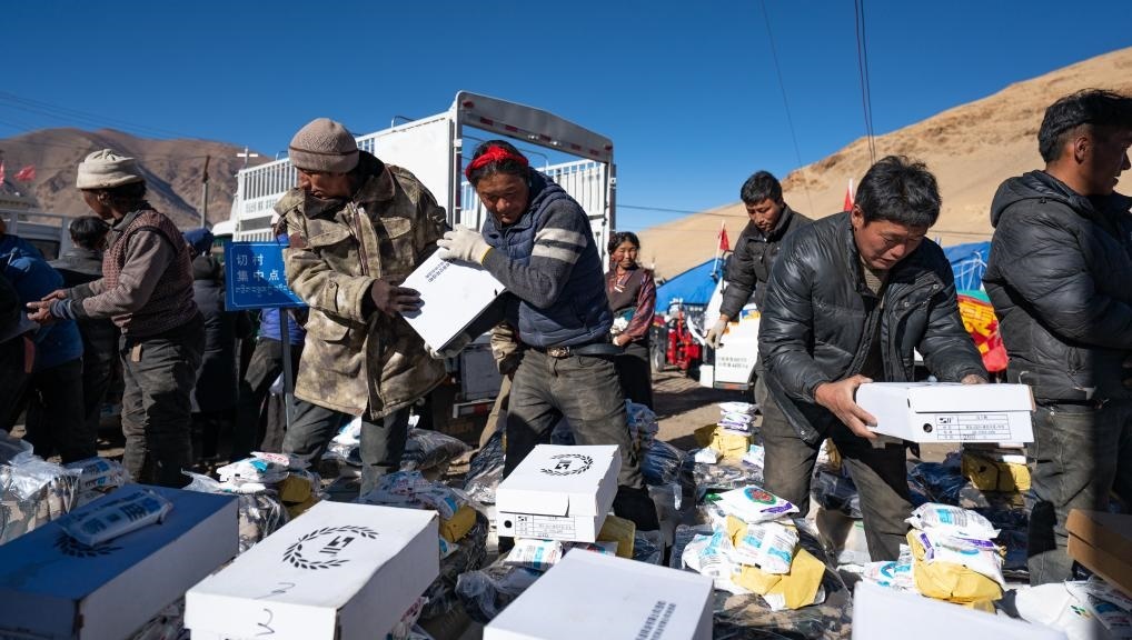 1月10日,在定結(jié)縣郭加鄉(xiāng)切村安置點(diǎn),群眾分配救災(zāi)物資。(新華社記者 丁增尼達(dá) 攝)
