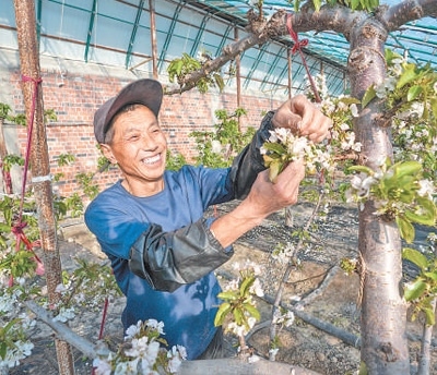 新疆生產(chǎn)建設(shè)兵團(tuán)第十師一八八團(tuán)海川鎮(zhèn)櫻桃大棚內(nèi),種植戶正在管護(hù)櫻桃樹。