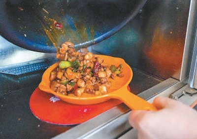 劉楊化身“主人公”,開始了“一肩挑”的演示:觸摸屏上勾選心儀菜品,手機掃碼支付,冷柜取出對應號碼的配菜盒,打開密封包裝,加入佐料包,將配菜盒整體放入炒菜機器人,然后選擇相應的炒菜程序。