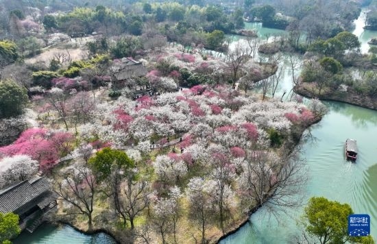 2月26日,游船經(jīng)過(guò)杭州西溪濕地一片盛開(kāi)的梅林(無(wú)人機(jī)照片)。