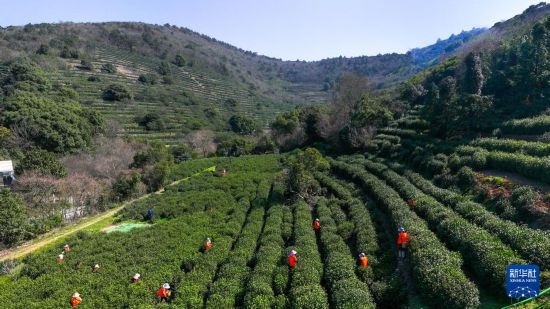 3月17日,在蘇州市吳中區(qū)西山國家現代農業(yè)示范園金海華碧水緣茶葉基地,采茶工在碧螺春古茶園采茶(無人機照片)。