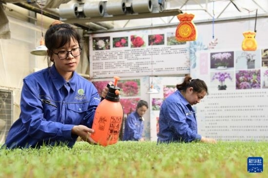 3月20日,在北大荒集團(tuán)黑龍江綏濱農(nóng)場有限公司溫室內(nèi),工作人員為孔雀草花苗補(bǔ)水。