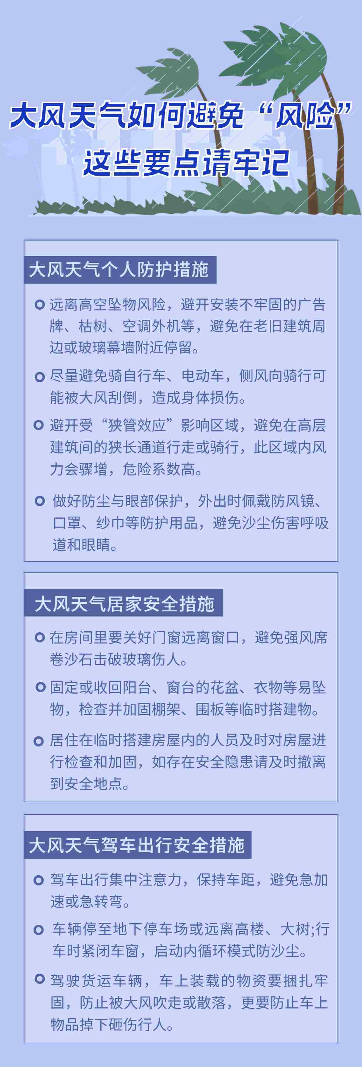 據(jù)氣象部門預報,未來幾日,全國多地將出現(xiàn)強風天氣,部分地區(qū)陣風風力可達12~13級。春季到來,大風天氣增多,給我們的生活帶來了諸多安全隱患。該如何做好防范?一起來了解。