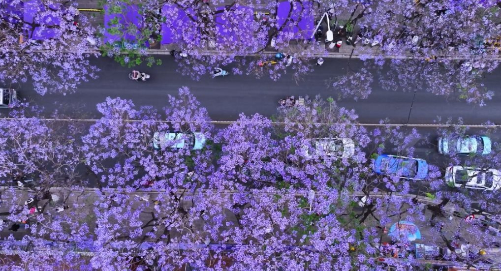 “五一”假期,昆明市教場中路延綿的紫色花海盛開。