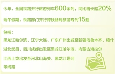 國鐵集團數(shù)據(jù)顯示:今年全國鐵路已開行旅游列車600余列,同比增長超20%。端午假期,鐵路部門開行跨鐵路局旅游專列15趟,包括從黑龍江哈爾濱、遼寧大連、廣東廣州出發(fā)至新疆烏魯木齊、喀什,湖北武昌、四川成都出發(fā)至黑龍江哈爾濱、內(nèi)蒙古海拉爾,江西上饒出發(fā)至河北山海關(guān)、黑龍江塔河等線路。