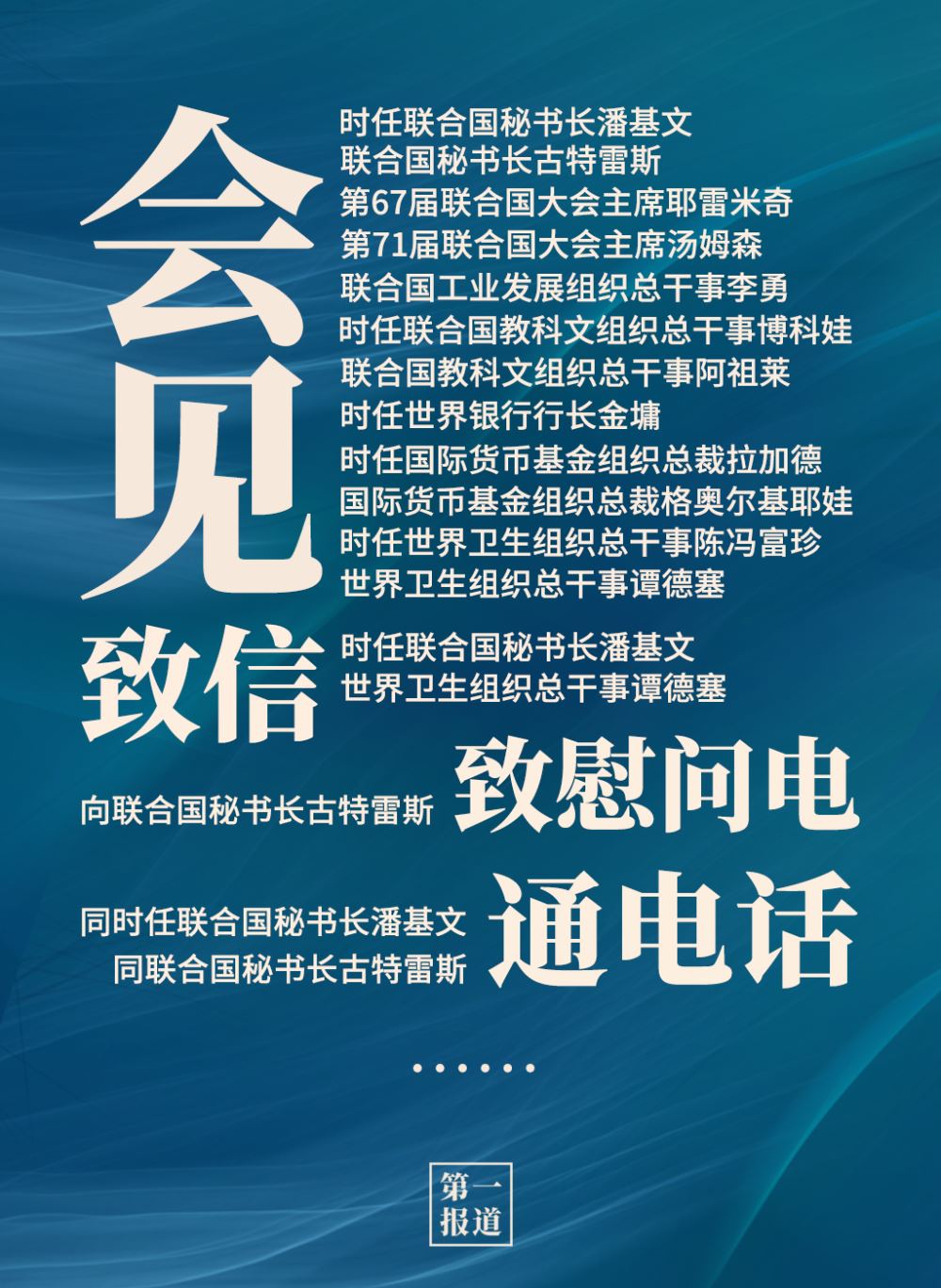 2013年以來,習主席通過會見、通話、致信函等多種方式同聯(lián)合國主要官員保持密切溝通?;訉ο蟀?lián)合國秘書長、聯(lián)合國大會主席,還有聯(lián)合國工業(yè)發(fā)展組織、聯(lián)合國教科文組織、世界銀行、國際貨幣基金組織、世界衛(wèi)生組織等聯(lián)合國專門機構主要負責人。